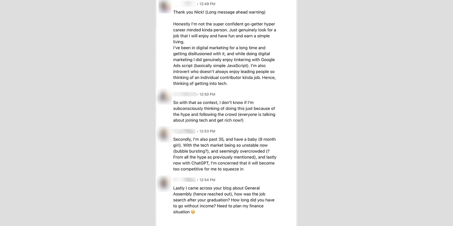 In today’s post, we’ll continue where we left off yesterday, replying to common concerns about getting into tech. I’ll respond to the same DM.